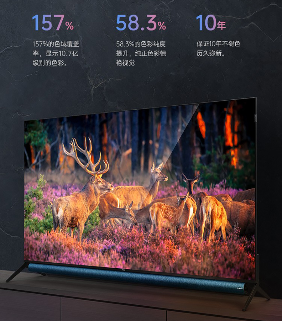 TCL 65R62C量子點電視,采用了納米級QLED原色量子點,具備DCI-P3標準96%高色域,D65標準硬件光源原彩色溫顯示。