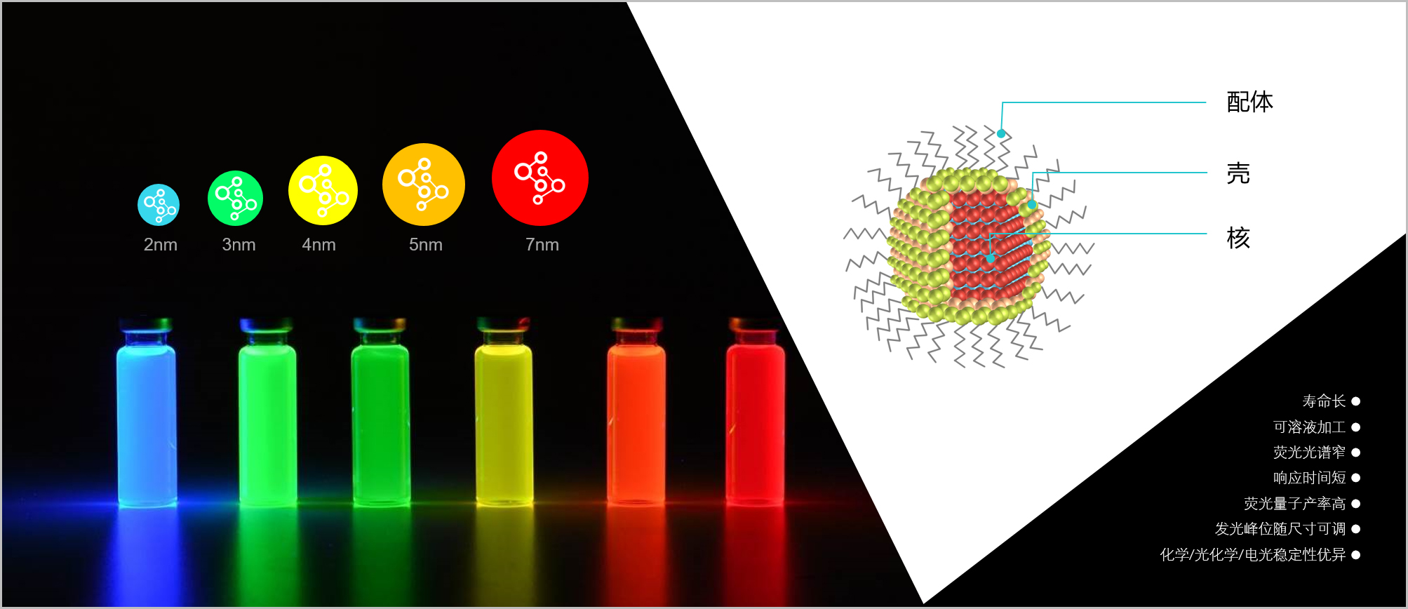 納晶科技擁有量子點(diǎn)半導(dǎo)體材料的核心專利,具備持續(xù)研發(fā)能力、規(guī)模制造能力、應(yīng)用技術(shù)和產(chǎn)品的整體解決方案開發(fā)能力。擁有年產(chǎn)50噸量子點(diǎn)濃縮液生產(chǎn)能力,可提供多種結(jié)構(gòu)量子點(diǎn)材料,包括含鎘量子點(diǎn)、無鎘量子點(diǎn)、電致發(fā)光量子點(diǎn)等產(chǎn)品。